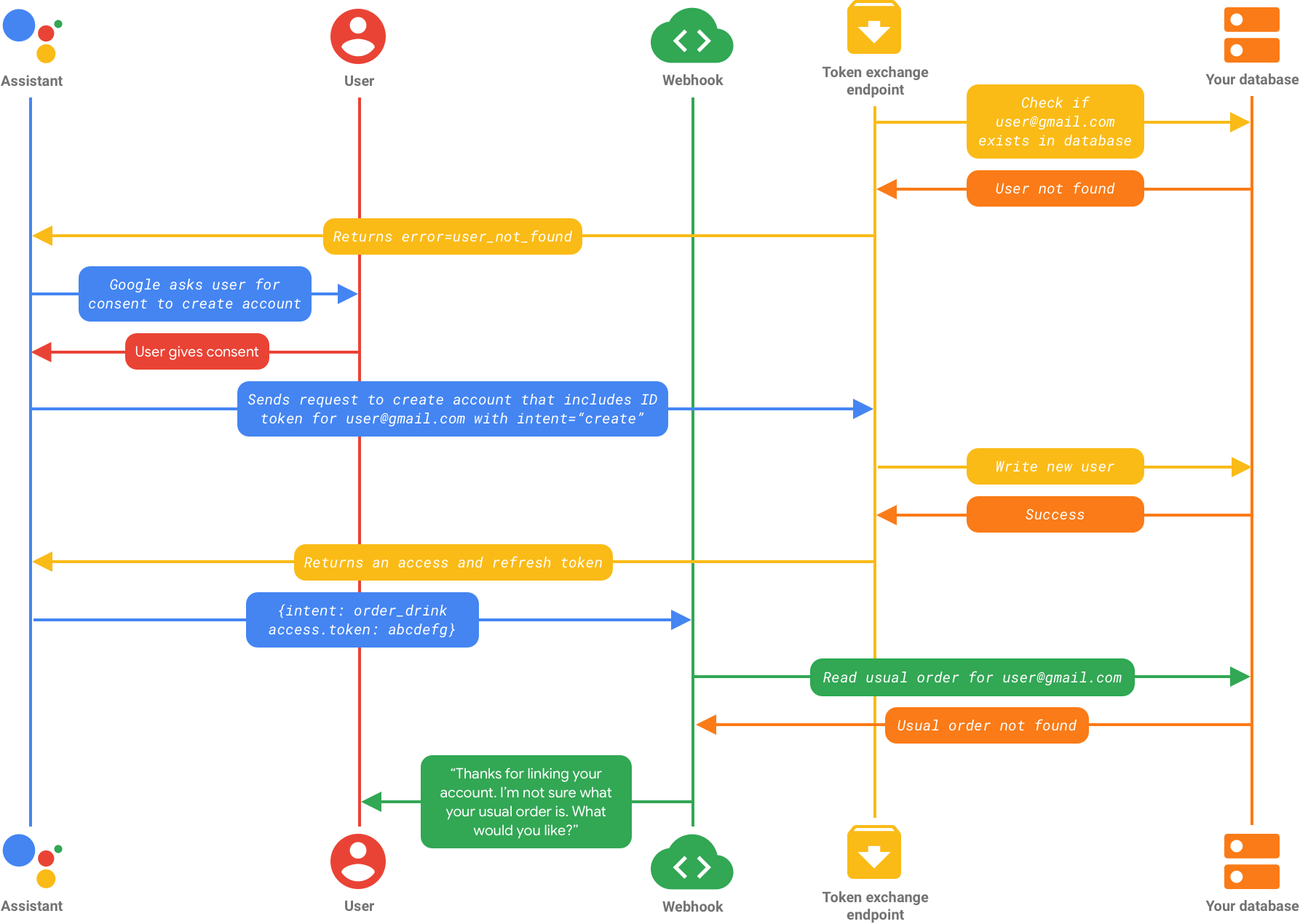 - หากมี แสดงว่าผู้ใช้ได้ลงชื่อเข้าใช้ระบบของคุณด้วย บัญชี Google และ Assistant จะลิงก์ข้อมูลประจำตัวของผู้ใช้กับ บัญชี Google ผู้ใช้สามารถสนทนาต่อกับ Assistant ที่ลิงก์กับบัญชีของตัวเอง