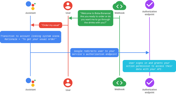 In the flow above, you transition to the account linking system scene and provide a customized rationale. Assistant asks the user if they want to link their account with your service and shows them a screen with the requested permissions. When the user consents, Google then redirects the user to your service’s authorization endpoint in the browser. The user signs in (or, depending on your configuration, creates a new account) and grants your Action permission to access their data.