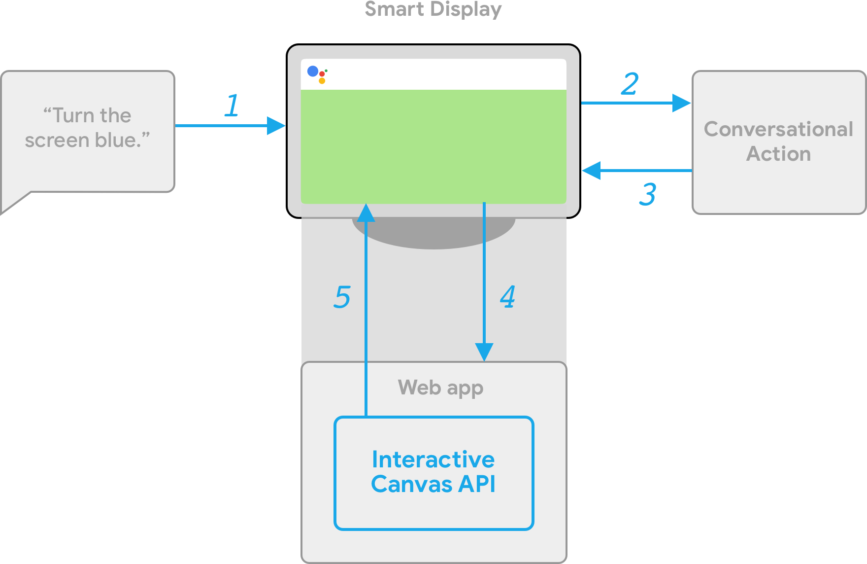 Users interacting with an Interactive Canvas Action have a back-and-forth conversation with Google Assistant to fulfill their goal. However, for Interactive Canvas, the bulk of this conversation occurs within the context of your web app. When connecting your Conversational Action to your web app, you must include the Interactive Canvas API in your web app code.