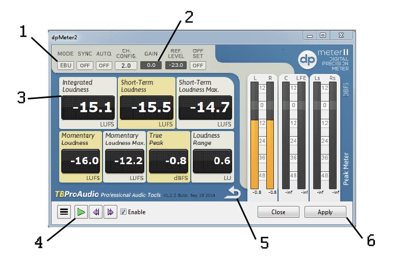 dpMeter II में हरे रंग के प्ले बटन पर क्लिक करें या अपने DAW में प्ले (स्पेसबार) को दबाएं (संख्या 4 नीचे दी गई है).