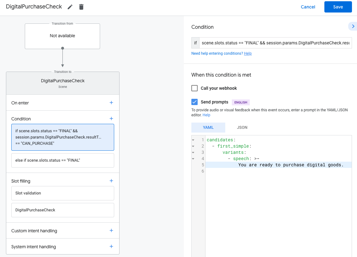 scene.slots.status == "FINAL" && session.params.CompletePurchase.purchaseStatus == "PURCHASE_STATUS_OK"Наведите курсор на только что добавленное условие и щелкните стрелку вверх, чтобы поместить его перед