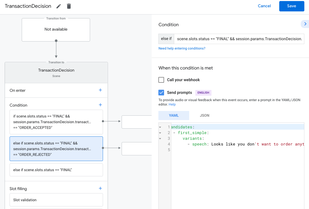 scene.slots.status == "FINAL" && session.params.TransactionRequirementsCheck.resultType == "CAN_TRANSACT"Hover your cursor over the condition you just added and click the up arrow to place it before