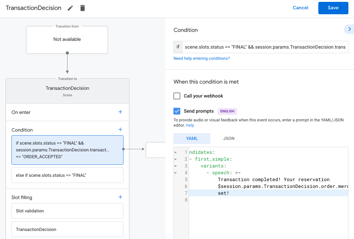 else if scene.slots.status == "FINAL"を選択します。[プロンプトを送信] を有効にし、簡単なプロンプトでユーザーに知らせる 取引を行うことができません。