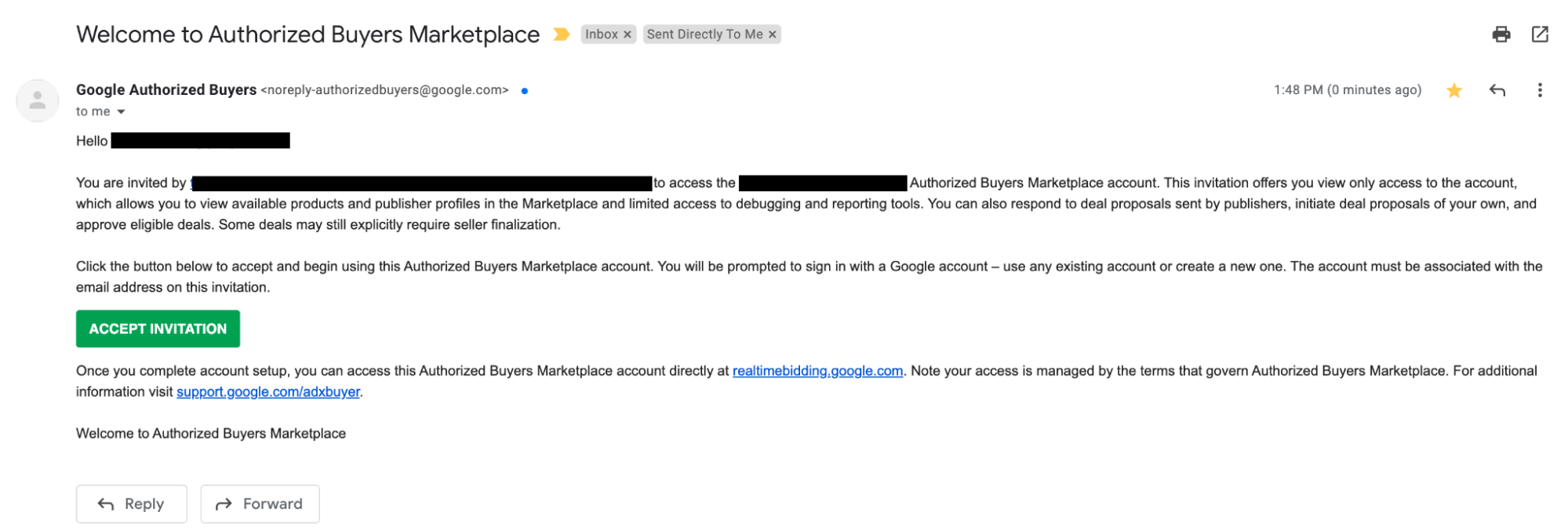 L'utente deve fare clic su ACCETTA INVITO per ottenere l'accesso all' UI di Authorized Buyers Marketplace. Devi aver eseguito l'accesso a un Account Google per accedere all'interfaccia utente di Authorized Buyers Marketplace.