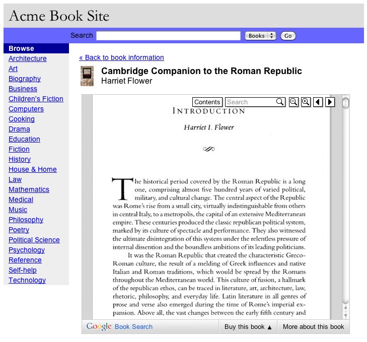 Вы также можете включить предварительный просмотр Google в качестве вторичного элемента страницы на своем сайте.| | Раздел предварительного просмотра В этом примере встроенное средство просмотра вставляется под заголовком «Предварительный просмотр книги» на странице книги. Вы можете реализовать это с помощью динамических ссылок и встроенного средства просмотра . Как указано в разделе об именах , вы также можете использовать «Предварительный просмотр Google» или просто «Предварительный просмотр» для заголовка. |