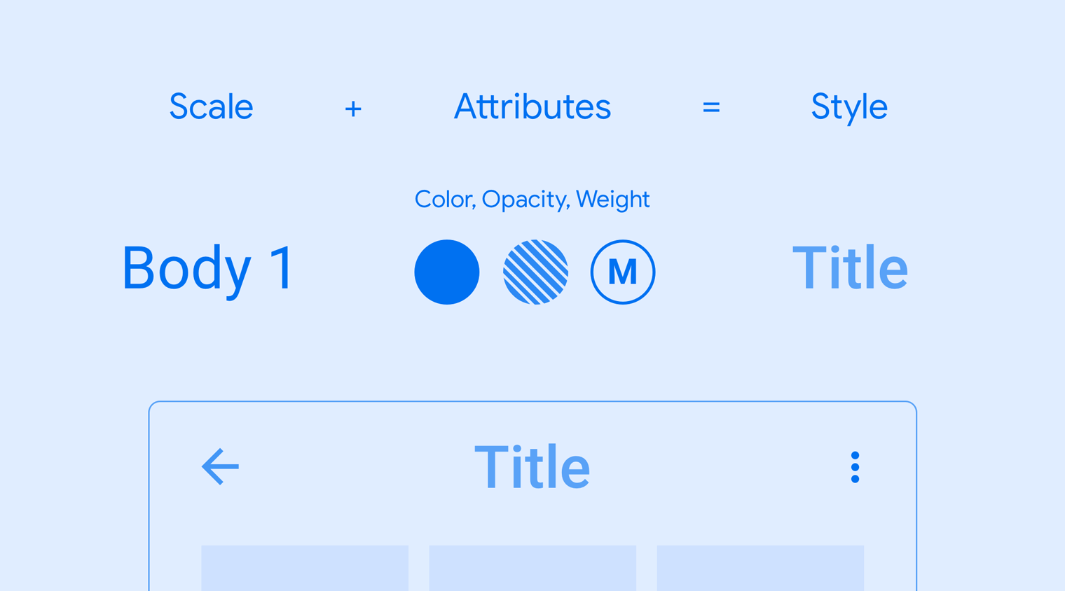 Cada estilo tipográfico consiste em um conjunto de escalas e atributos, como cor, opacidade e espessura da fonte. Esses atributos podem ser adicionados a qualquer estilo de tipografia para criar um efeito, seja a intenção de chamar a atenção ou reduzir a ênfase.