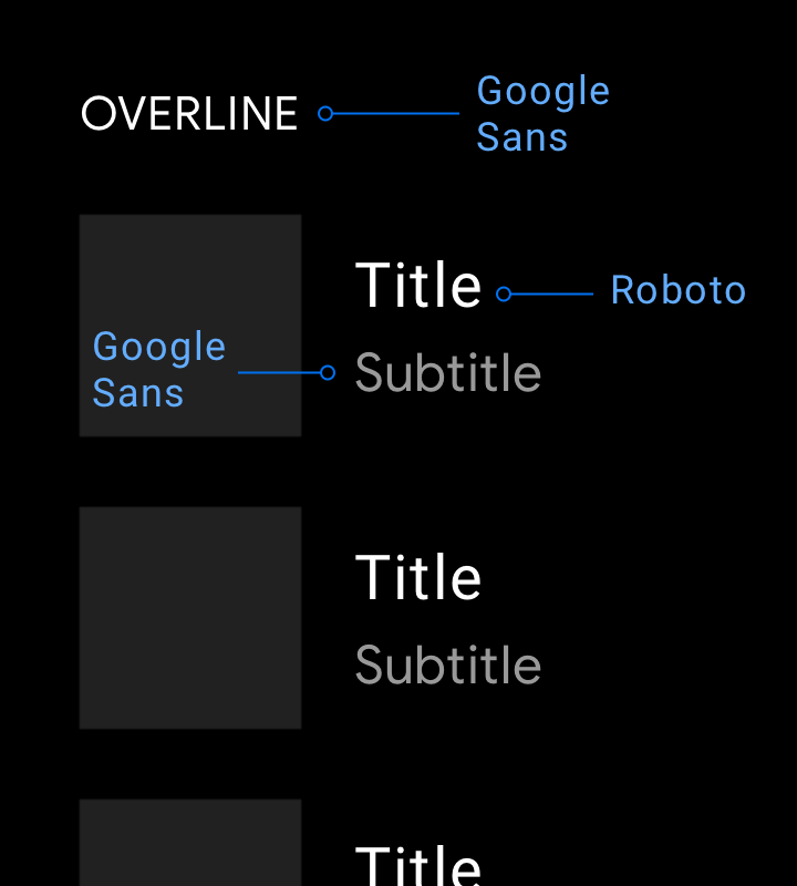 O Google Sans deve ser usado para tipos de tamanho de 32 dp ou maiores. O Roboto é usado em todos os outros lugares porque é legível em tamanhos menores.