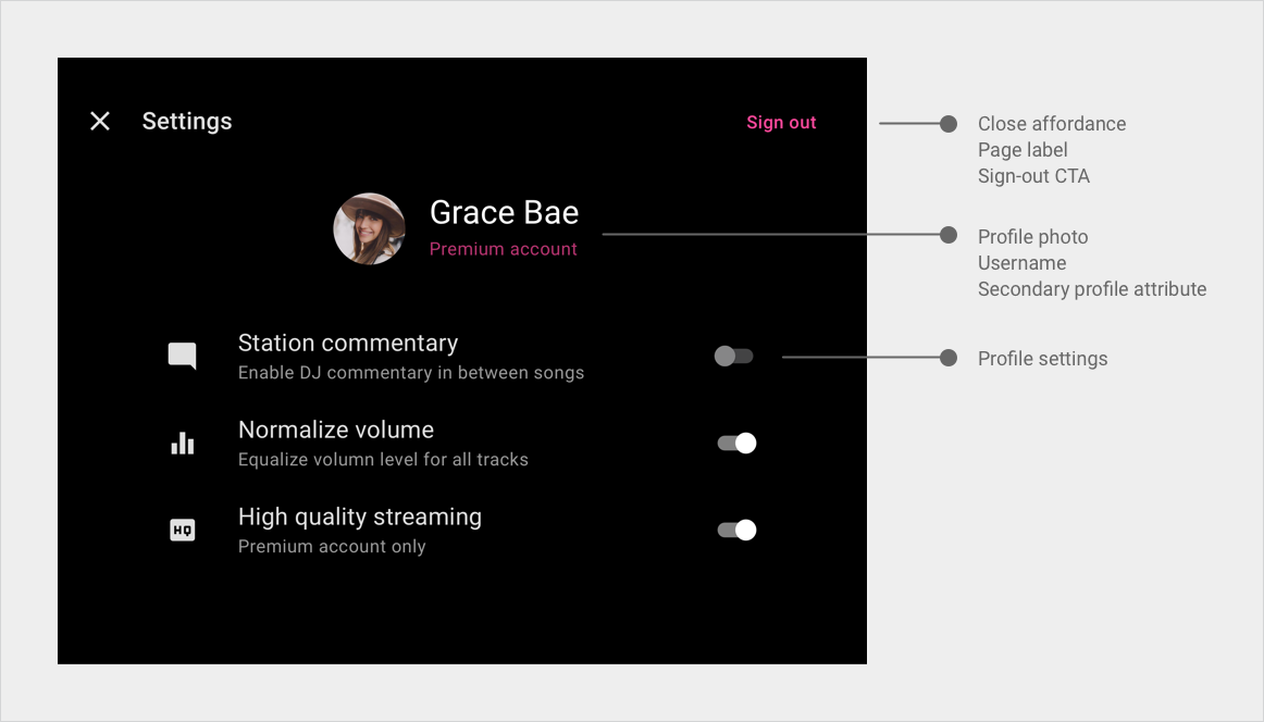 בנוסף לקבלת החלטות מסוימות לגבי גישה לתוכן וכניסה לאפליקציה, ייתכן שיהיה צורך לעצב מסכי הגדרות.