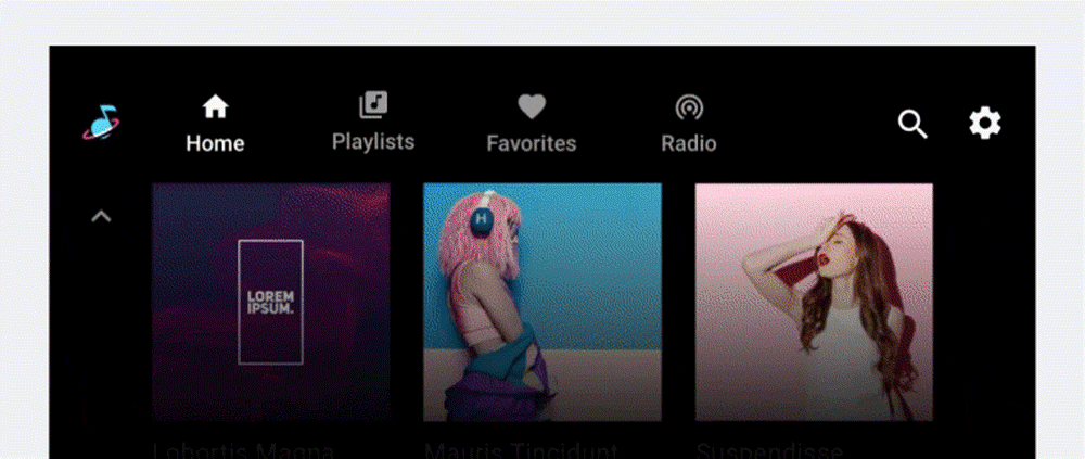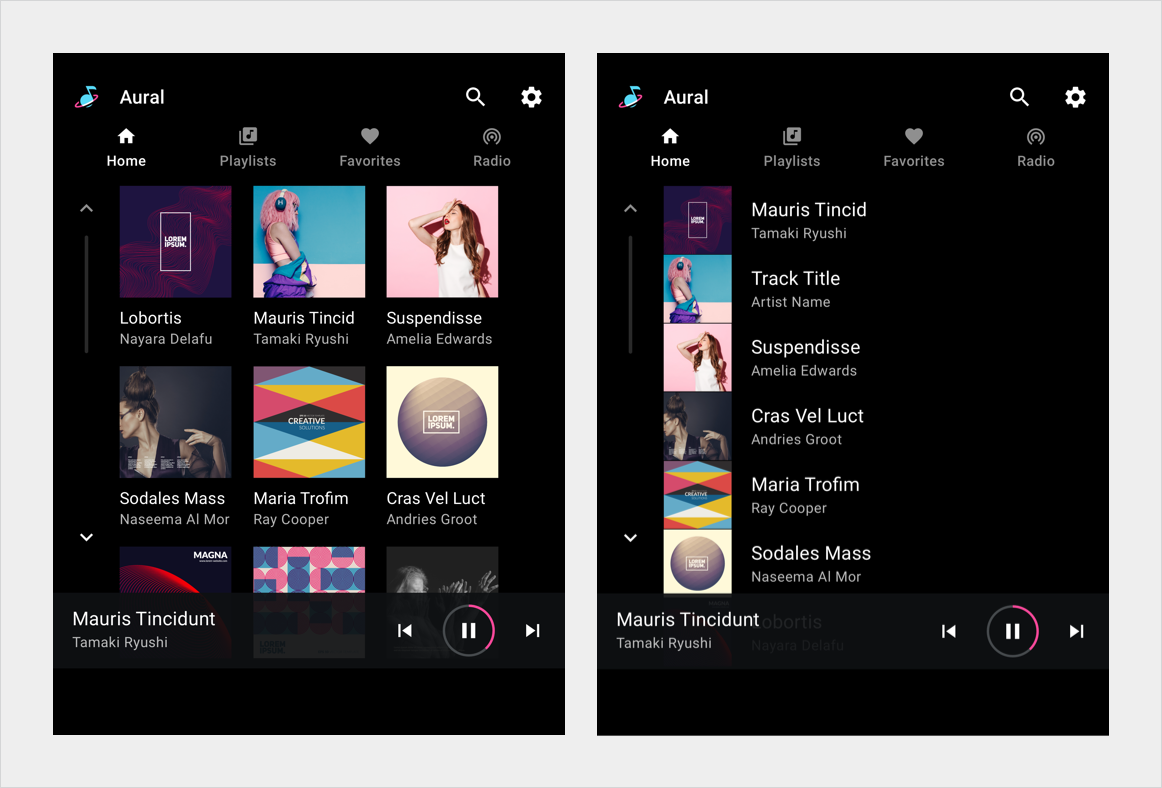 אפשר להציג תוכן מדיה בתצוגת רשת, בתצוגת רשימה או בשילוב של שניהם באותו מרחב תוכן. ניתן לארגן את התוכן לפי קטגוריות המופרדות באמצעות כותרות משנה. המשתמשים מדפדפים בטבלאות או ברשימות על ידי גלילה אנכית.