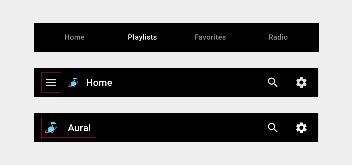 يمكن أن يتضمن شريط التطبيق أيضًا رمز التطبيق وعناصر التحكم في التطبيق، وهي عناصر تمت مناقشتها في العلامة التجارية للتطبيق وتسجيل الدخول والإعدادات والبحث.