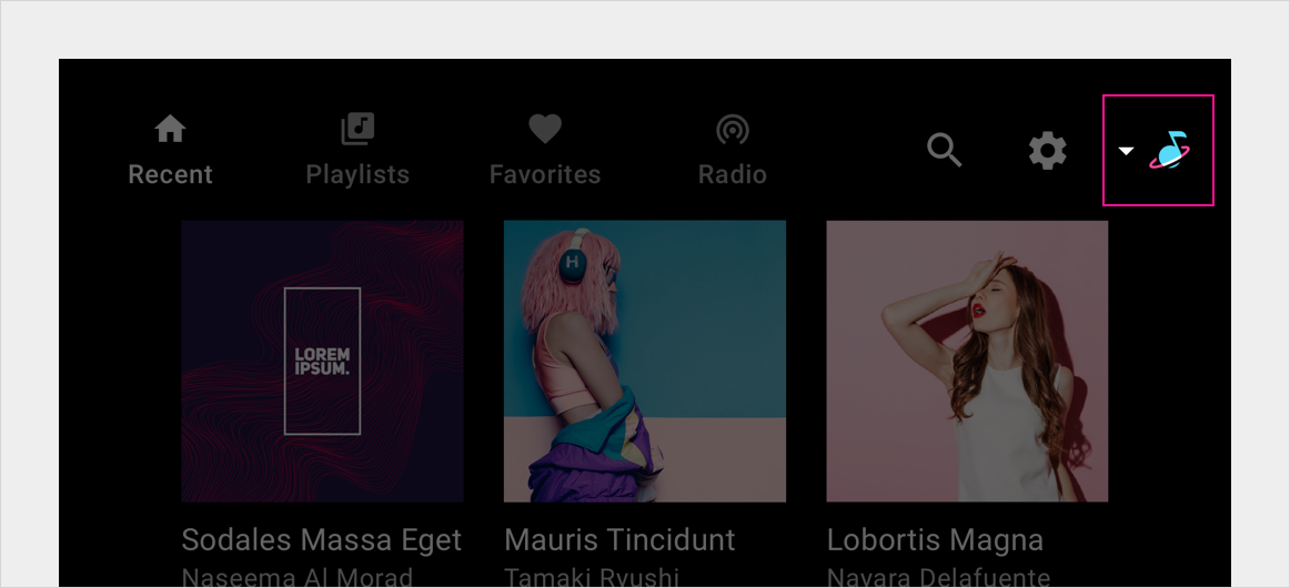 يتكون التنقل الأساسي لطرق عرض المحتوى داخل تطبيق وسائط بشكل عام من ما يصل إلى 4 علامات تبويب في شريط التطبيق (ما لم تكن الشاشة صغيرة للغاية ولا توجد مساحة لعرض علامات التبويب). تتيح علامات التبويب هذه للمستخدمين التنقل أفقيًا بين طرق عرض المحتوى في المستوى الأعلى من العرض الهرمي للتطبيق.