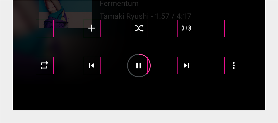 Para garantir o uso consistente nos serviços de mídia, a linha de baixo de controles (ou a única linha, se a barra de controle não estiver expandida) precisa mostrar os controles na ordem mostrada abaixo. A linha superior, que aparece somente quando a barra de controle é aberta, é reservada para até cinco ações personalizadas.