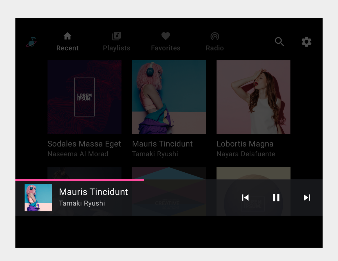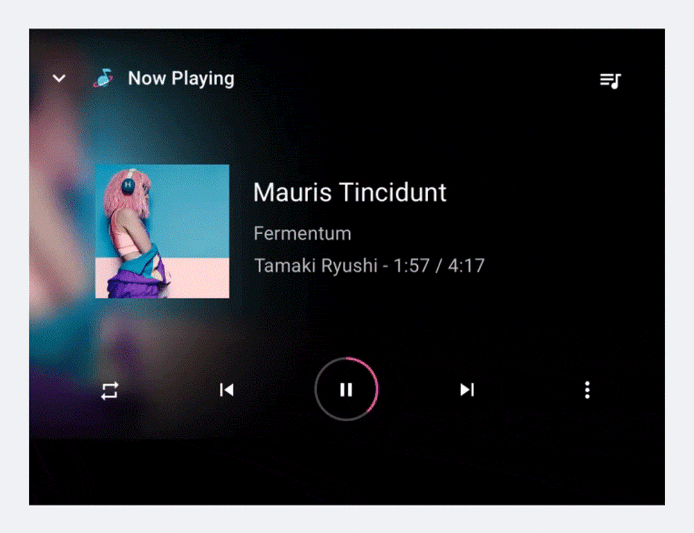 Para iniciar a reprodução, um usuário seleciona um item reproduzível no espaço do conteúdo, como um álbum ou uma música, e a visualização de reprodução ocupa todo o espaço do conteúdo. A visualização de reprodução mostra metadados e controles de mídia para o conteúdo selecionado. Os usuários podem controlar a reprodução usando esses controles e também gestos.