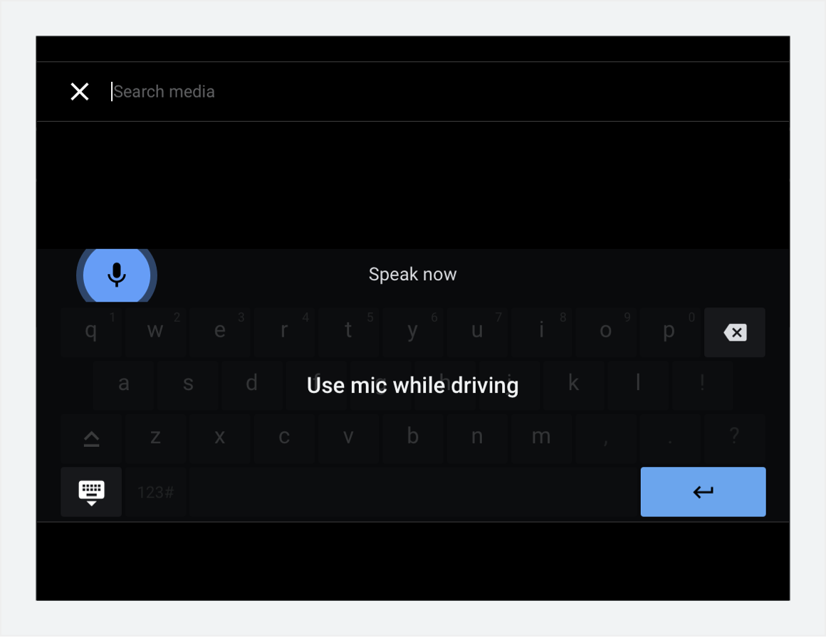 Quando o usuário está dirigindo, a funcionalidade de pesquisa invoca o teclado otimizado para unidades, permitindo a entrada de texto por voz. Quando o carro está estacionado, ele invoca o teclado padrão. Os fabricantes de automóveis projetam os dois teclados (ou personalizam os teclados fornecidos pelo Google).