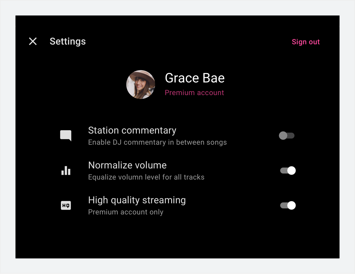 Essa função precisa incluir apenas as configurações necessárias para o uso do app (como informações da conta, preferências e funções de login e logout), além daquelas relevantes para ouvir mídia no carro (como desativar conteúdo explícito).