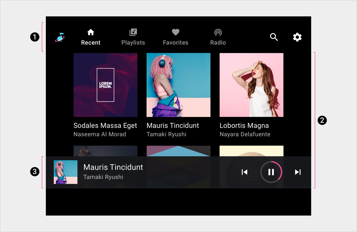 تشغل عناصر التحكّم في التطبيق (الموضَّحة في أعلى يسار الصفحة في المثال أدناه) جزءًا من شريط التطبيق غير المستخدَم للعلامة التجارية أو التنقّل الأساسي. وتتيح هذه الميزات الوصول إلى وظائف البحث داخل التطبيق والإعدادات لتطبيق الوسائط الحالي.