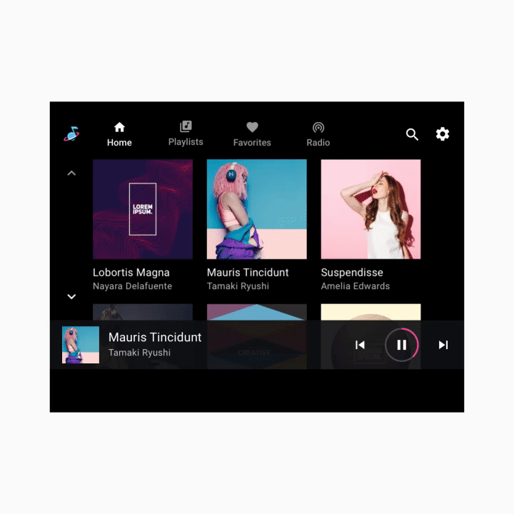 פקדי האפליקציות (מוצגים בפינה השמאלית העליונה בדוגמה שלמטה) תופסים את החלק בסרגל האפליקציה שלא משמש למיתוג או לניווט הראשי. הם מספקים גישה לפונקציות חיפוש והגדרות בתוך האפליקציה עבור אפליקציית המדיה הנוכחית.