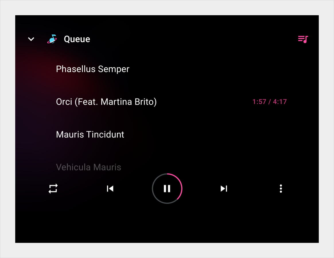 באפליקציות מדיה, סרגל הבקרה משמש בתצוגת ההפעלה של פקדים מסוג 'הפעלה/השהיה', 'הקודם', 'הבא' ופקדים אחרים, כולל אמצעי בקרה לפעולות מותאמות אישית של צד שלישי.