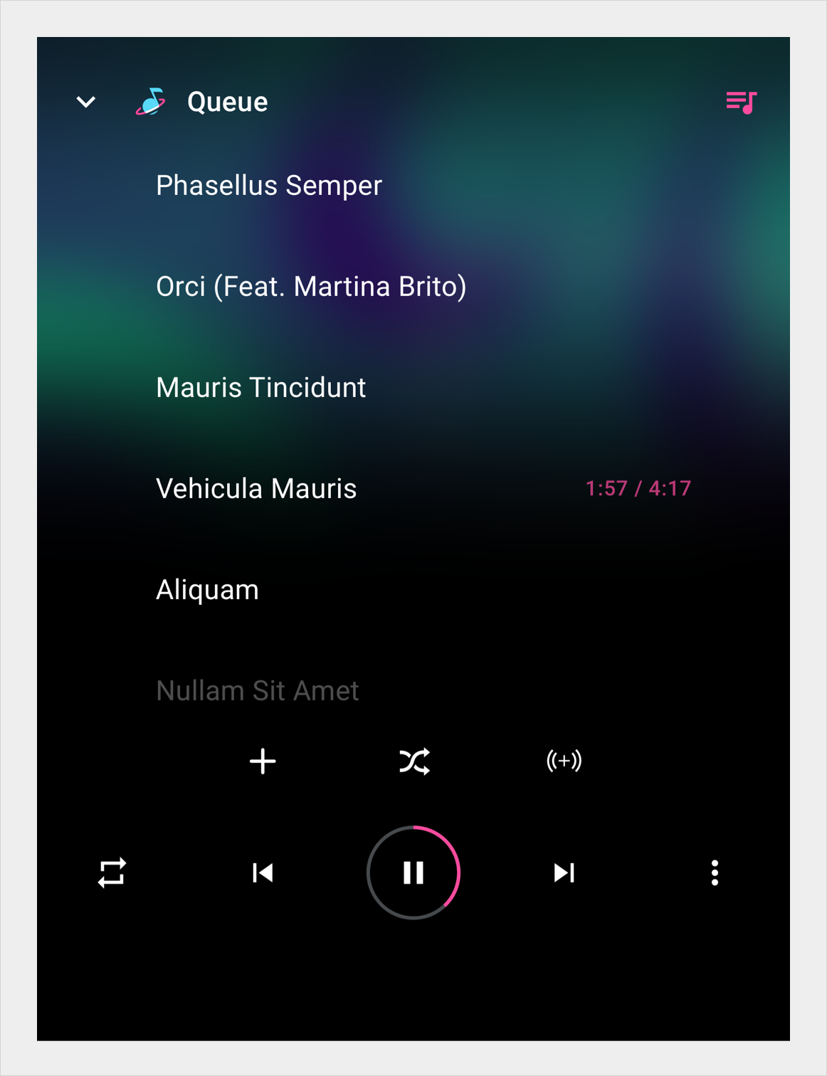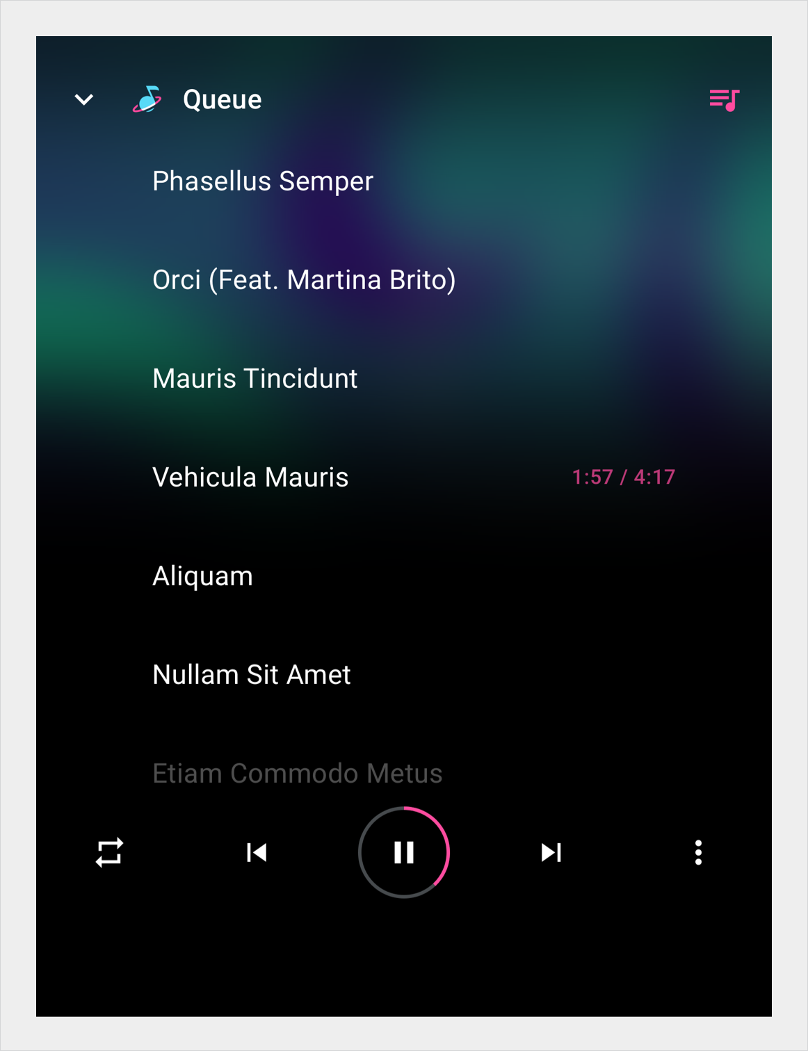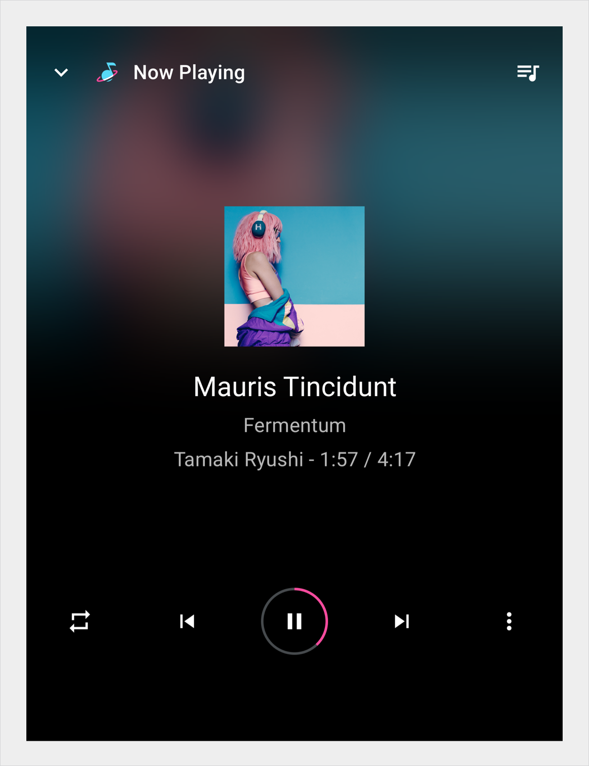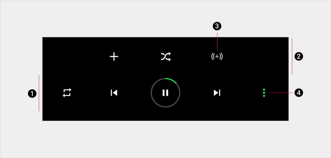 Em apps de música, a barra de controle é usada na visualização de reprodução para os controles "Reproduzir/Pausar", "Anterior", "Próximo" e outros, inclusive para ações personalizadas de terceiros.