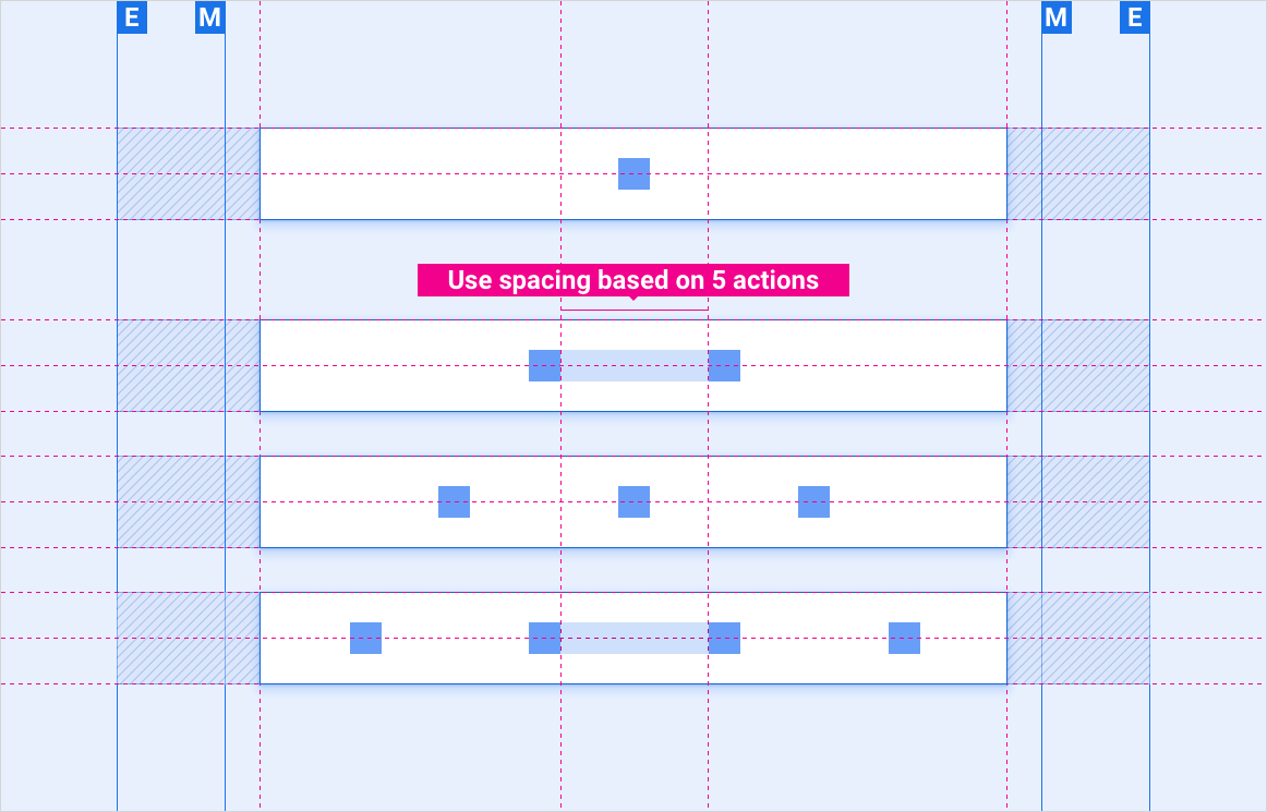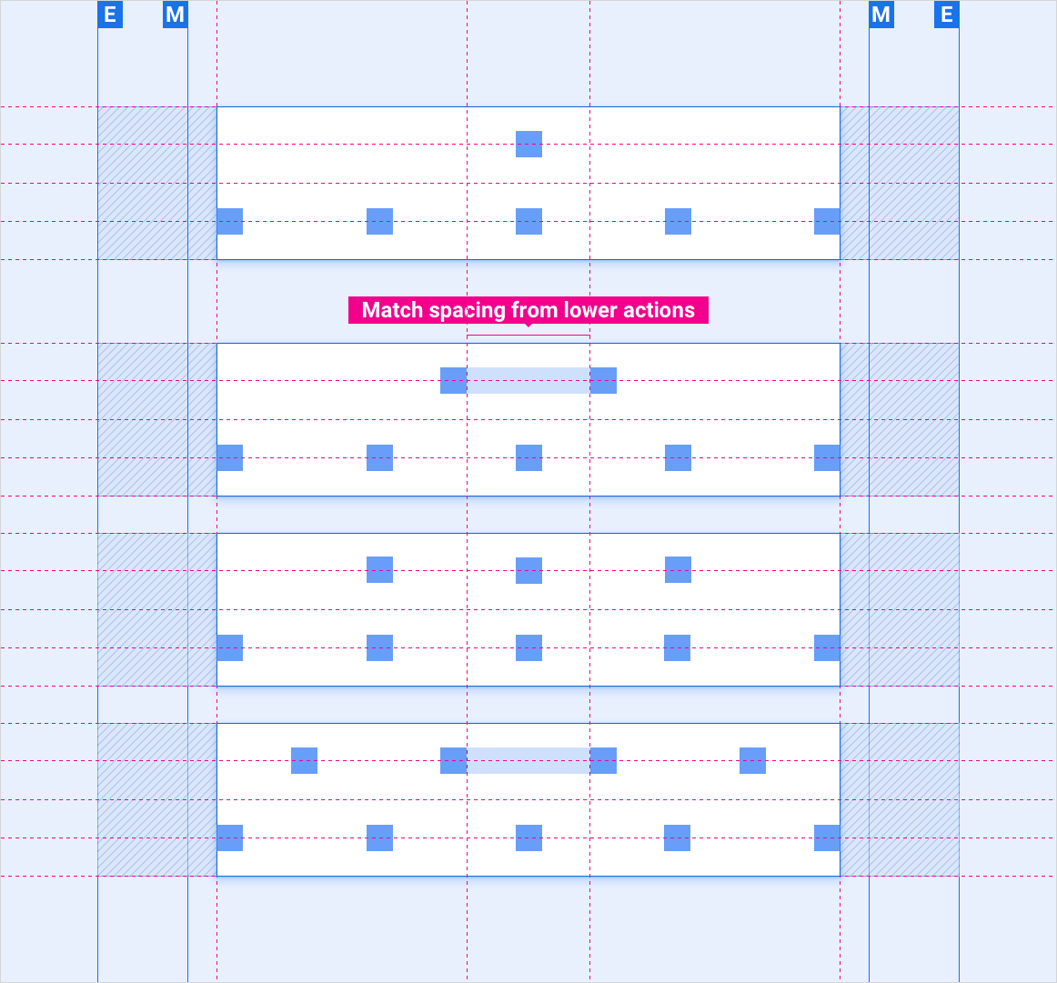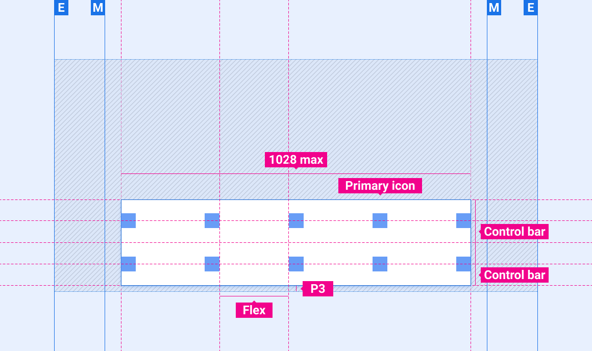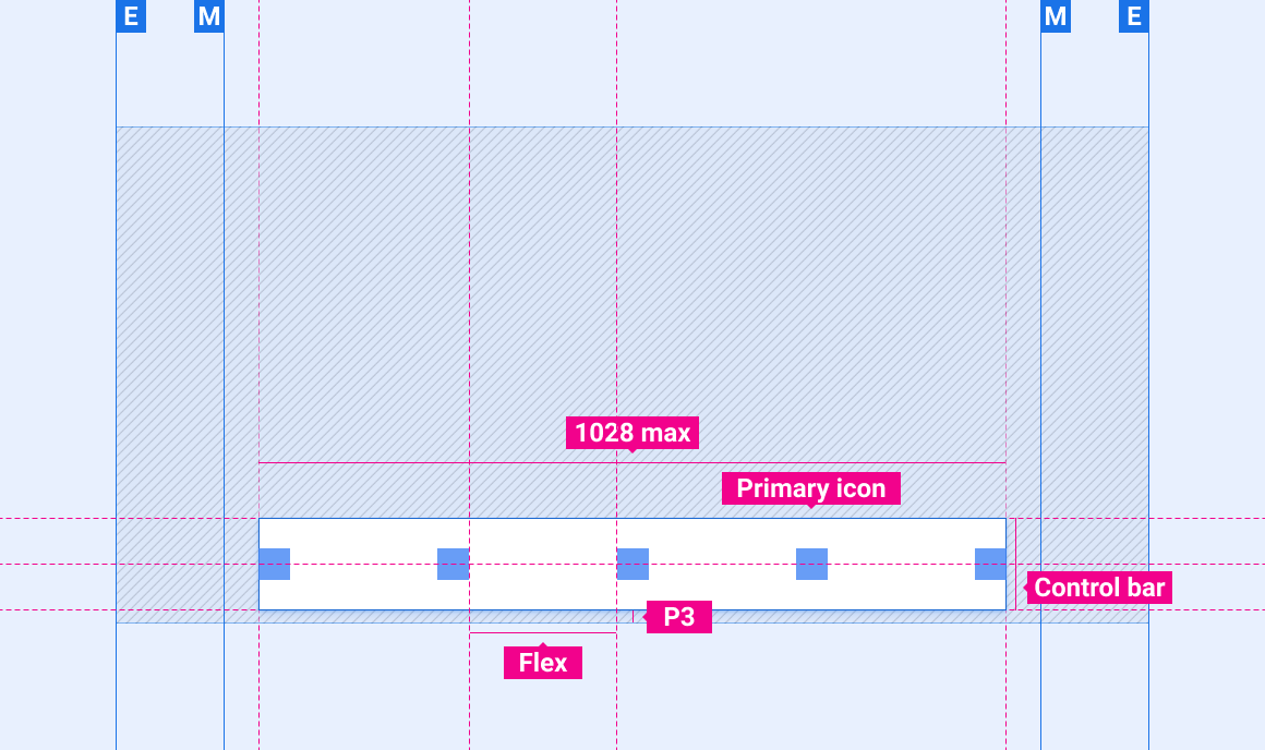 Esses layouts de referência mostram como adaptar a barra de controle para acomodar telas de várias larguras e alturas. As categorias de largura e altura são definidas na seção Layout. Todos os valores de pixel estão em pixels renderizados, antes de ocorrer qualquer diminuição ou aumento de amostragem.