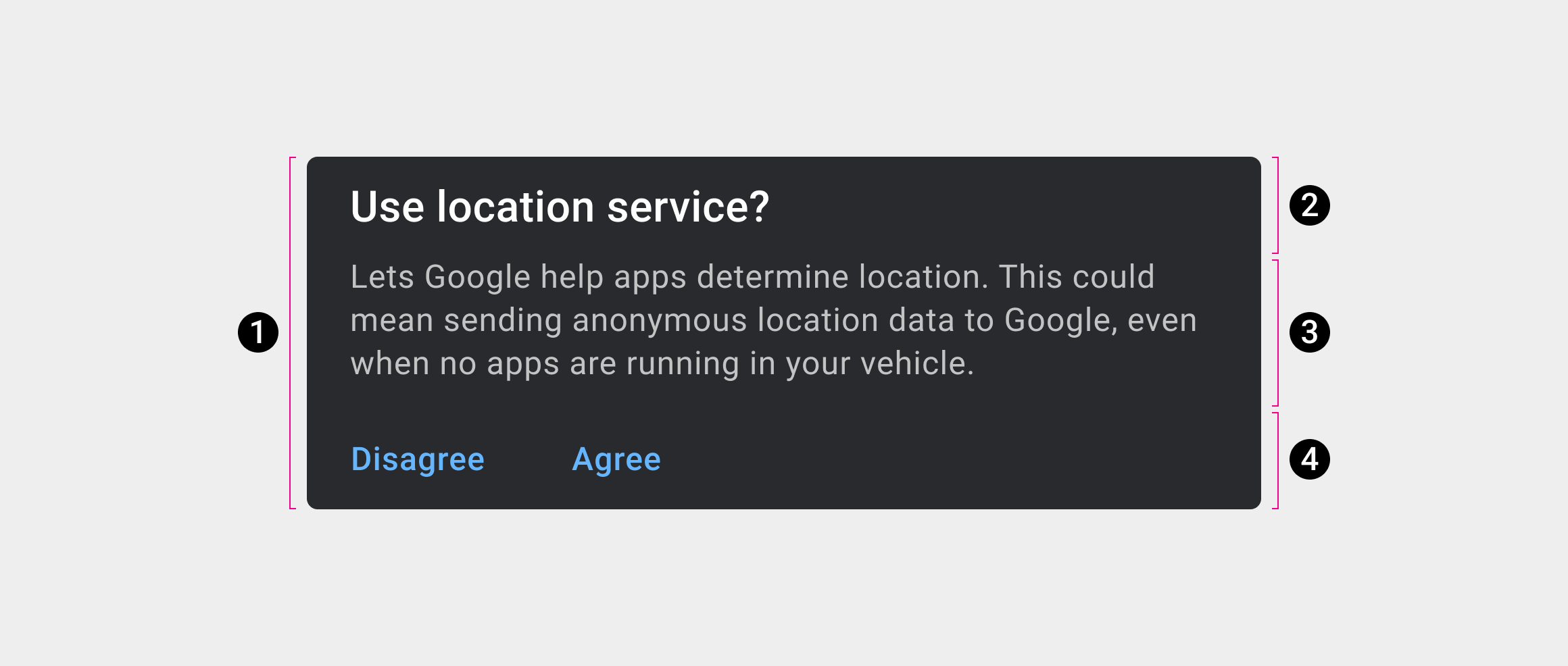 Uma caixa de diálogo pode ser um alerta, que requer interação do usuário. Também pode ser uma caixa de diálogo de seleção ou confirmação, em que o usuário precisa fazer ou confirmar uma escolha. A caixa de diálogo mantém o foco até ser dispensada ou até que a ação necessária seja realizada. Como as caixas de diálogo causam interrupções, elas devem ser usadas com moderação.