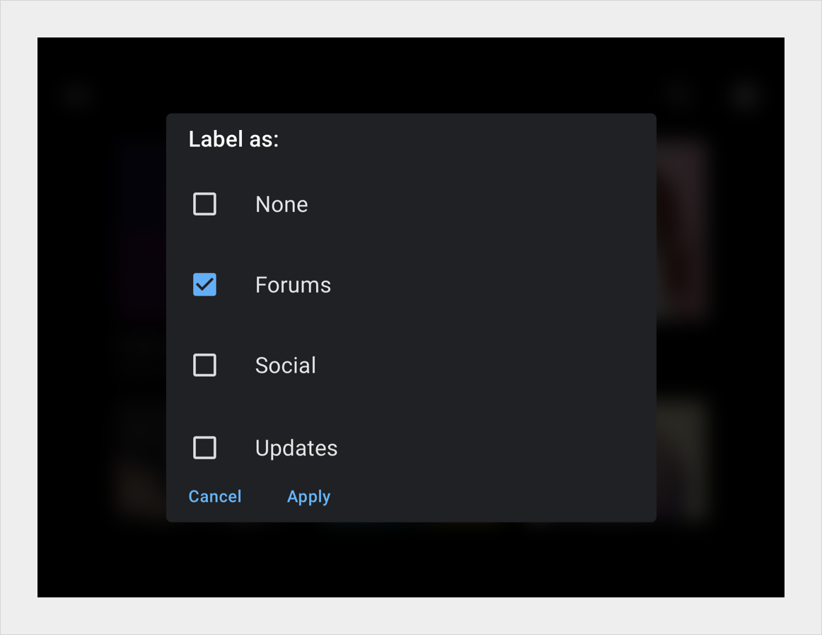 As caixas de diálogo são janelas modal que aparecem na frente de um app para mostrar informações sobre tarefas que exigem uma resposta imediata do usuário.
