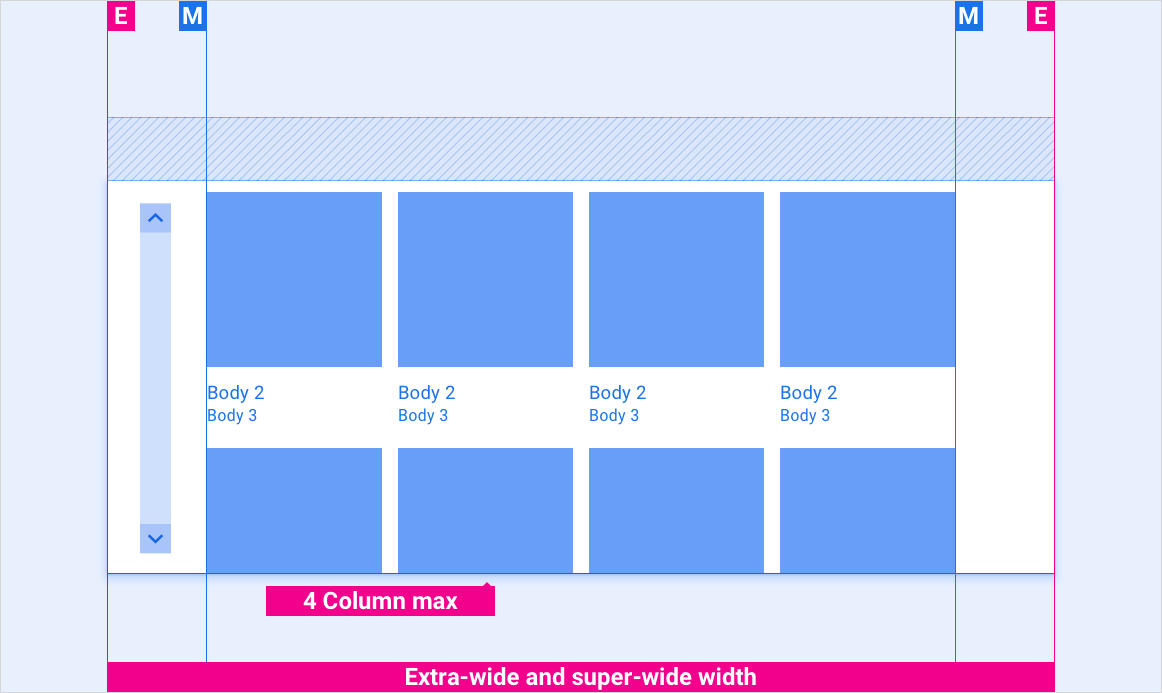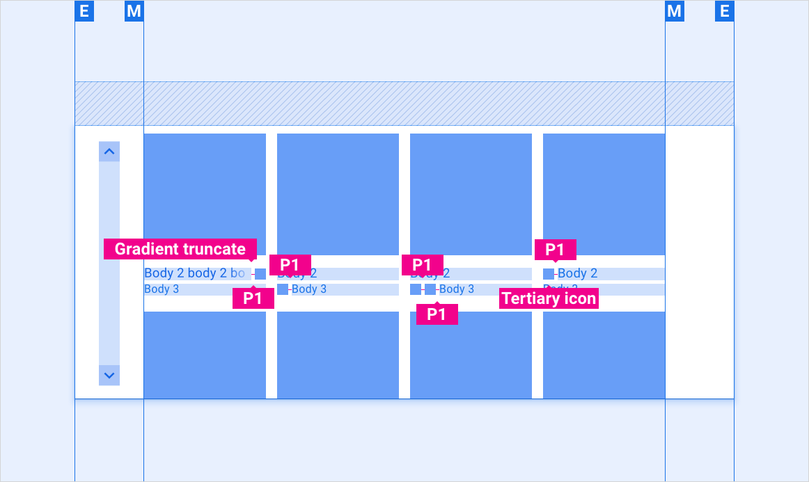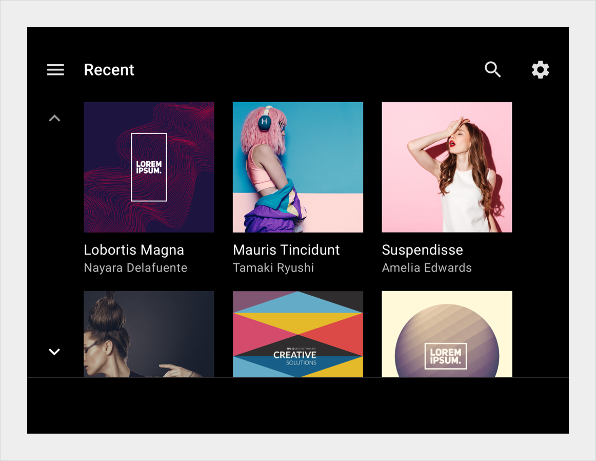 As grades têm rolagem vertical e podem variar em tamanho, espaçamento e número de colunas. O conteúdo da grade também pode ser agrupado em categorias.