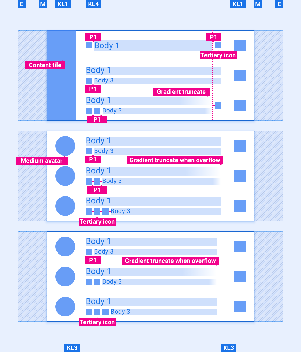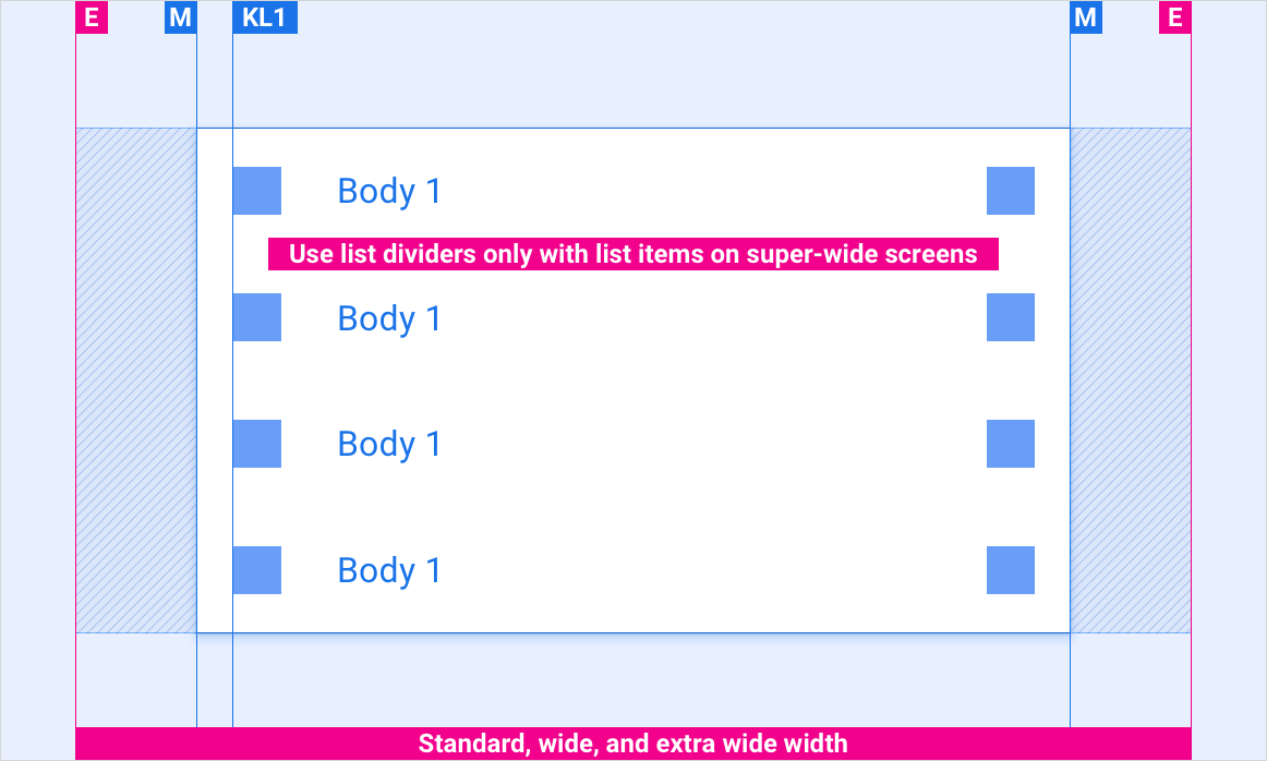 Các bố cục tham chiếu này cho thấy cách điều chỉnh các mục danh sách cho phù hợp với các màn hình có chiều rộng và chiều cao khác nhau. (Danh mục chiều rộng và chiều cao được xác định trong phần Bố cục.) Lưu ý rằng tất cả các giá trị pixel đều tính bằng pixel được kết xuất, trước khi xảy ra bất kỳ quá trình giảm hoặc tăng tần số lấy mẫu nào.
