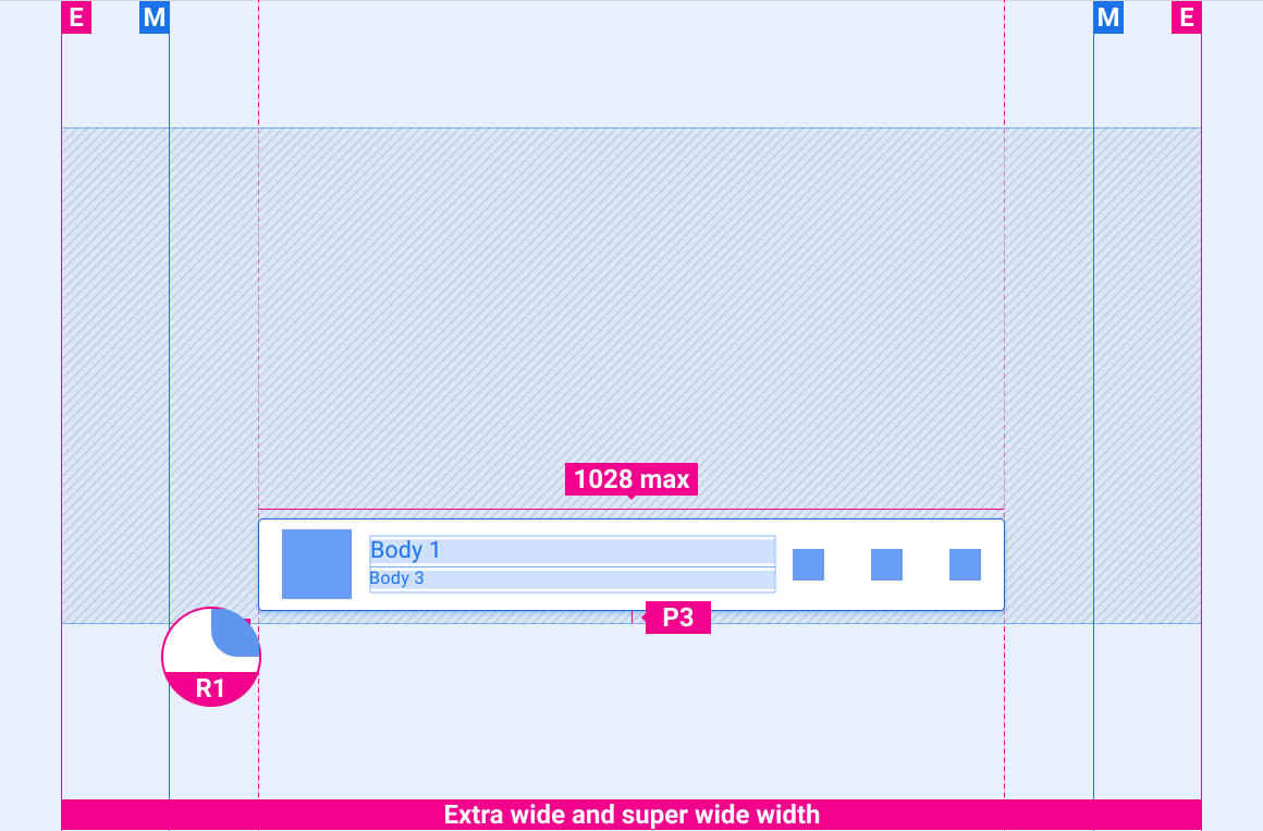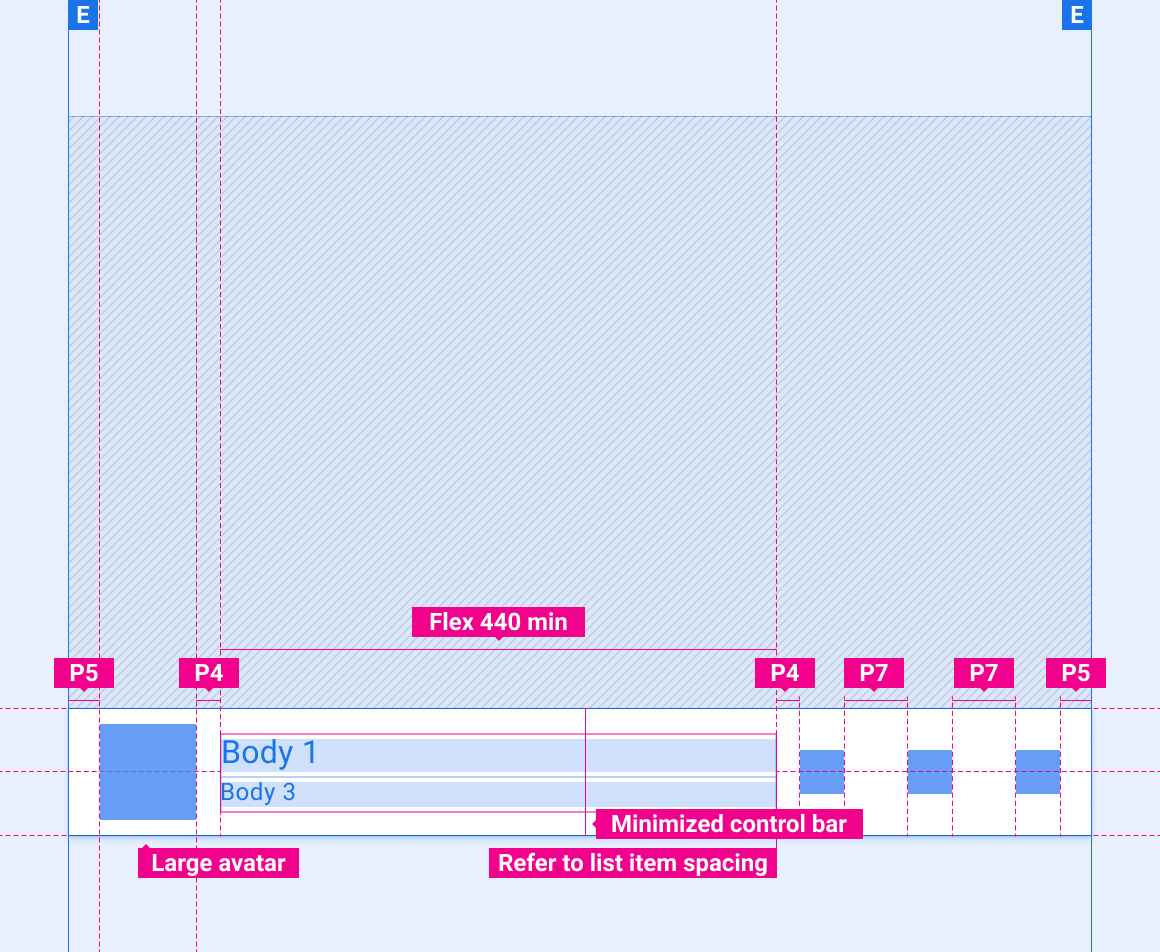 Esses layouts de referência mostram como adaptar a barra de controle minimizada para acomodar telas de várias larguras e alturas. As categorias de largura e altura são definidas na seção Layout. Todos os valores de pixel estão em pixels renderizados, antes de qualquer diminuição ou aumento de amostragem.