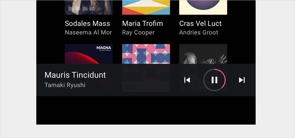 Por exemplo, a barra de controle minimizada para apps de música mantém um pequeno conjunto de controles de mídia e metadados disponíveis em todo o app quando a música estiver tocando. Ela também pode abrir uma visualização da reprodução em tela cheia.