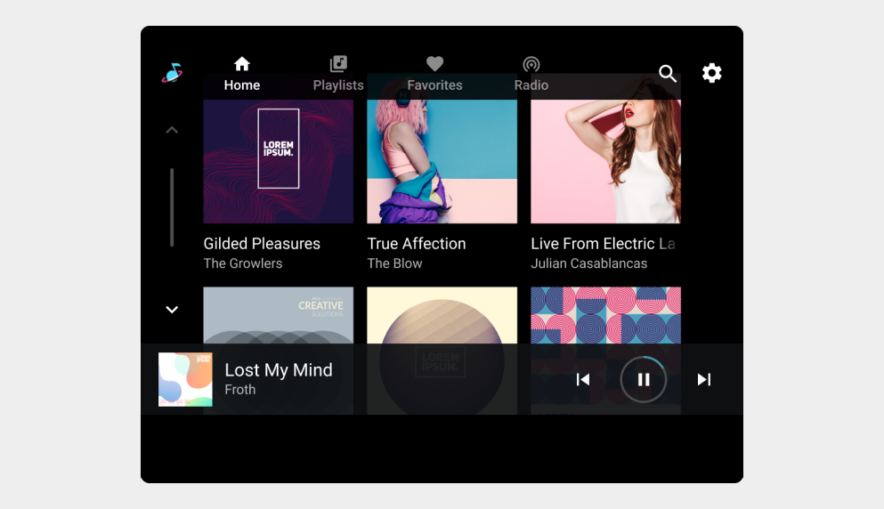 A forma como você define o item de mídia raiz e seus descendentes estabelece a hierarquia de conteúdo do app. É possível aplicar estilos de conteúdo a itens de mídia navegáveis para determinar se os filhos deles são exibidos em visualizações de grade ou de lista e se eles estão organizados por títulos.