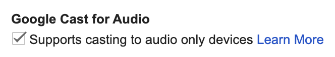 ऑडियो ऐप्लिकेशन ऐसे ऐप्लिकेशन होते हैं जो Google Cast SDK Developer Console में मौजूद, रिसीवर ऐप्लिकेशन की सेटिंग में Google Cast for Audio की सुविधा के साथ काम करते हैं