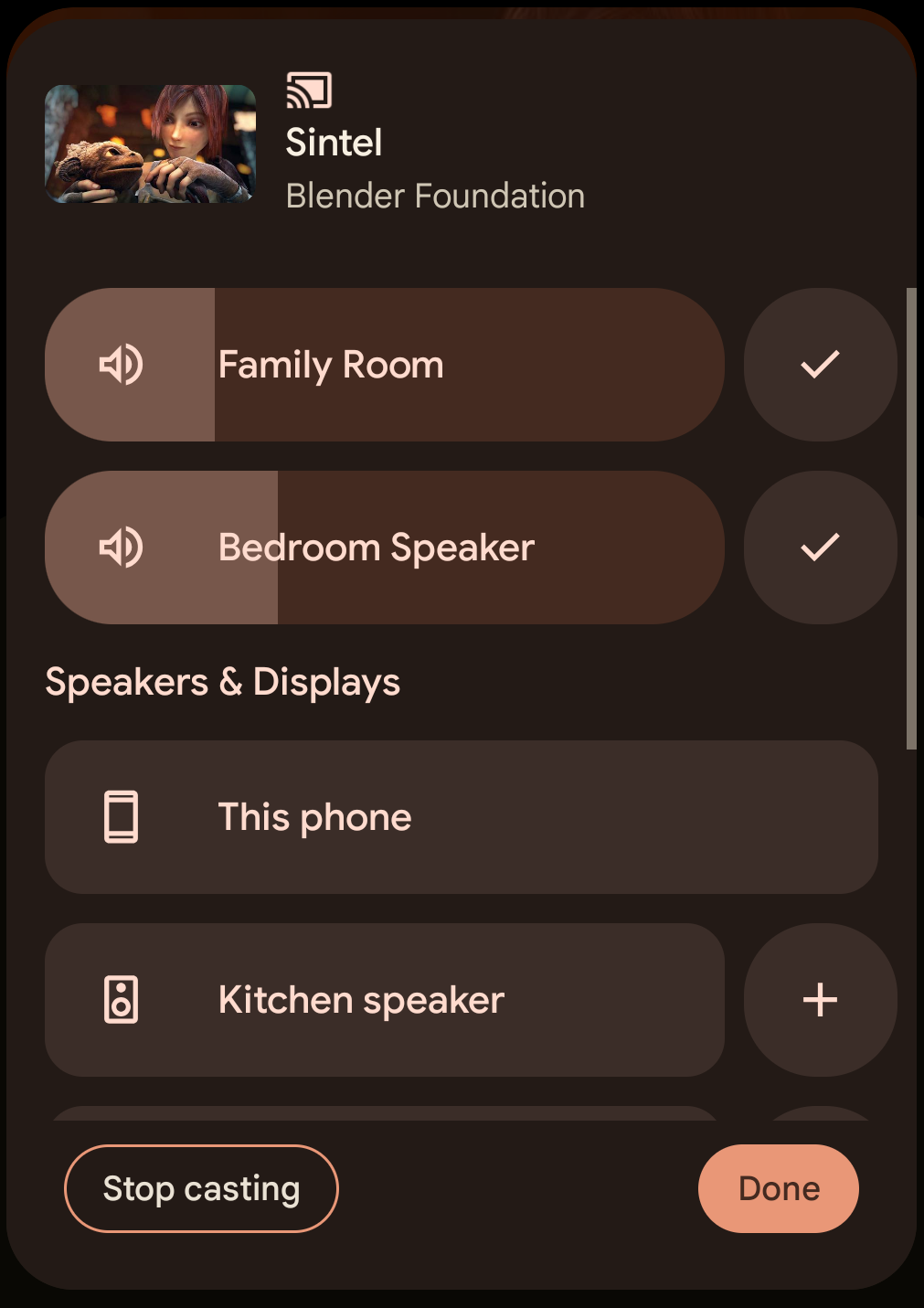 Aplikacje audio, które korzystają z przełącznika wyjścia, mogą rozszerzać dźwięk na wiele głośników obsługujących Cast podczas sesji przesyłania strumieniowego za pomocą funkcji rozszerzania strumienia.