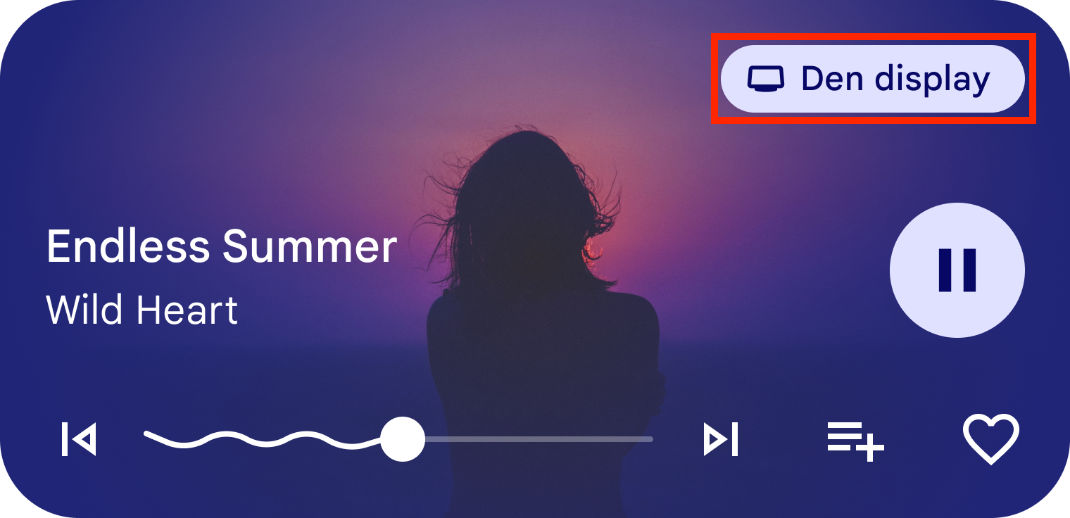 Para usar o seletor de saída, os apps de áudio e vídeo precisam criar uma notificação de mídia para mostrar o status e os controles de reprodução da mídia para reprodução local. Isso exige a criação de um