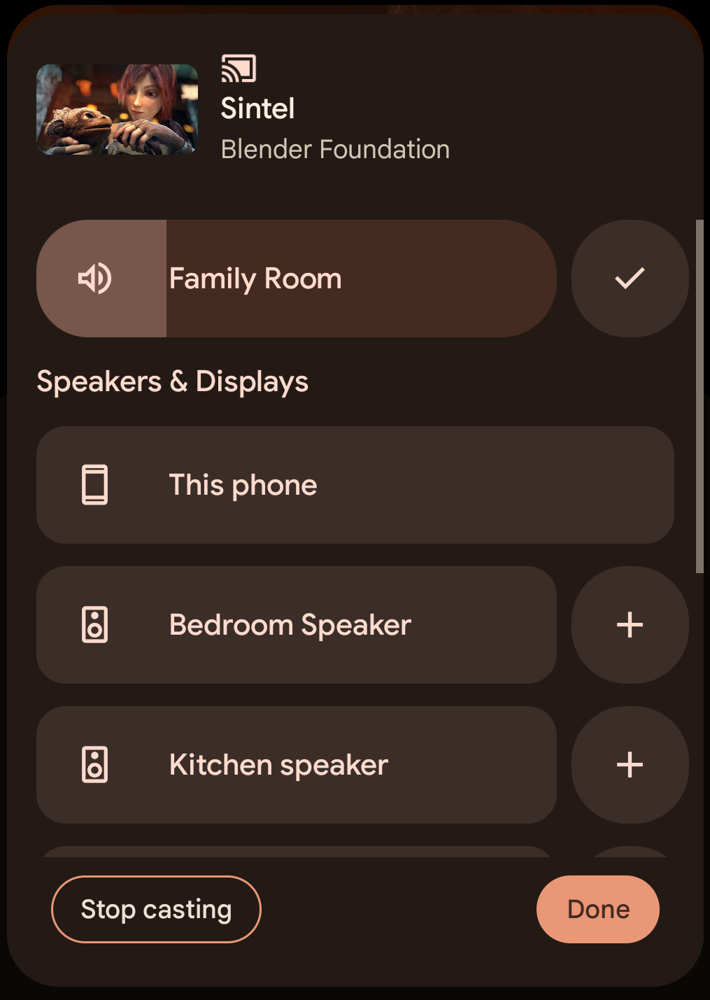 - कास्ट करने की सुविधा वाले डिवाइस पर फिर से टैप करें. इससे डिवाइस को डाइनैमिक ग्रुप से हटा दिया जाएगा.