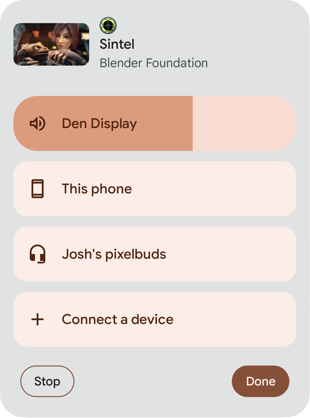 आउटपुट स्विचर, स्थानीय और रिमोट डिवाइसों को दिखाता है. साथ ही, डिवाइसों की मौजूदा स्थितियां भी दिखाता है. जैसे, डिवाइस चुना गया है या नहीं, कनेक्ट हो रहा है या नहीं, और वॉल्यूम का मौजूदा लेवल क्या है. अगर मौजूदा डिवाइस के अलावा कोई दूसरा डिवाइस भी है, तो 'दूसरे डिवाइस पर चलाएं' पर क्लिक करके, मीडिया को चुने गए डिवाइस पर ट्रांसफ़र किया जा सकता है.
