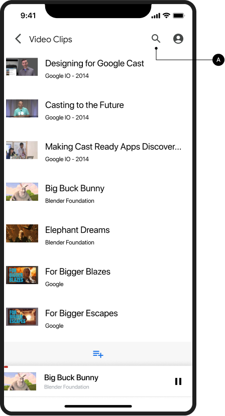 Google Cast verwendet ein Multitasking-Modell, mit dem Nutzer während des Castings in der Sender-App und anderen Apps surfen können. Die Cast-Schaltfläche muss auf jedem Bildschirm sichtbar sein, auf dem abspielbare Inhalte vorhanden sind. So muss der Nutzer nicht lange suchen, um die Wiedergabe von Inhalten auf dem Fernseher zu pausieren oder zu beenden.