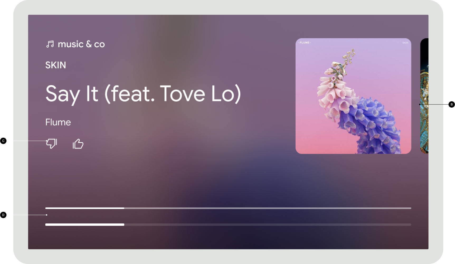 B 音訊接收器:將所有中繼資料元素放在受保護區域上方,且不顯示任何控制項元素。輕觸螢幕時,系統會顯示播放器控制項。