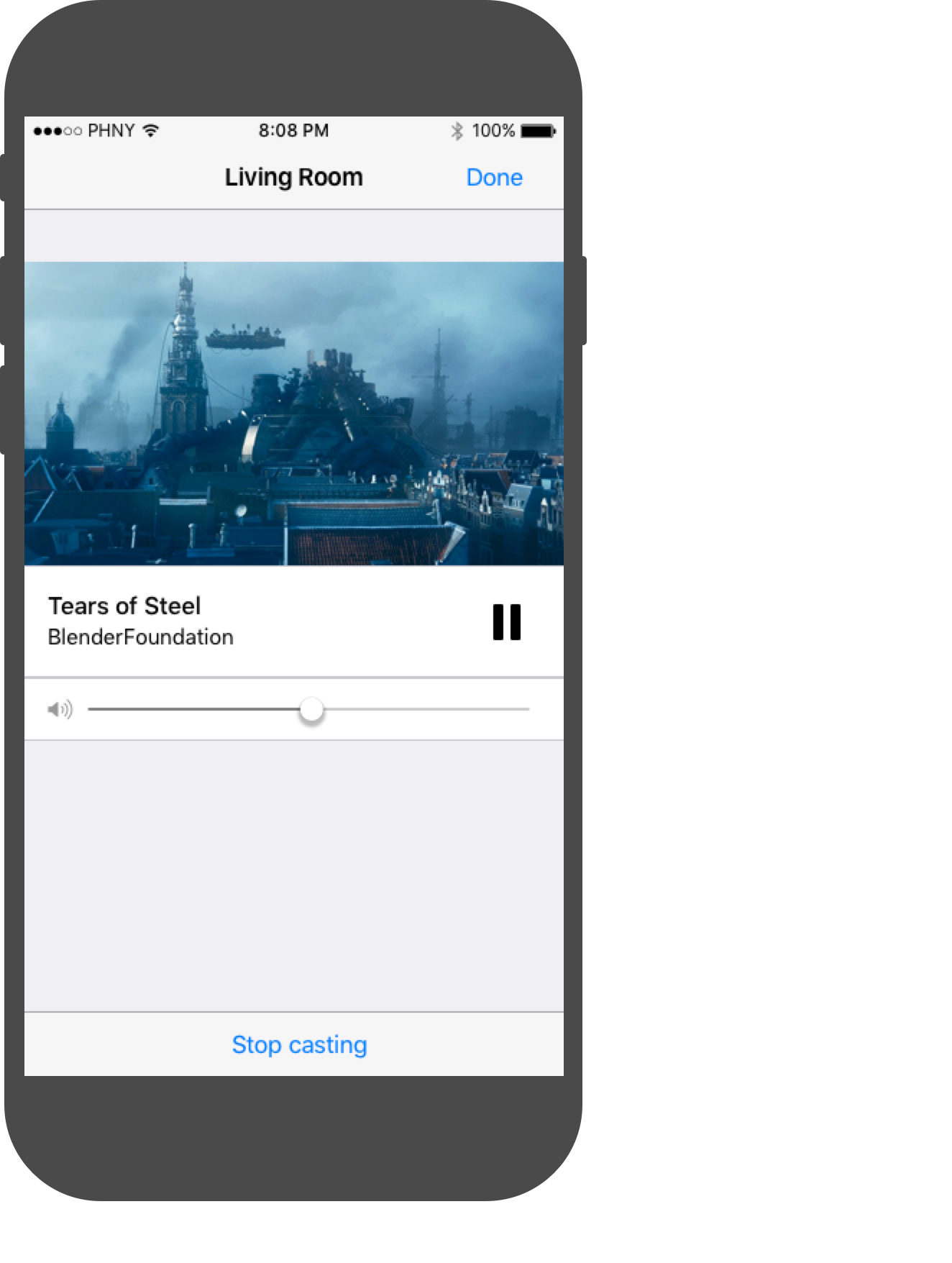 Aplikasi pengirim harus memungkinkan pengguna mengontrol volume konten yang diputar di TV atau speaker, menggunakan tombol volume hardware dan/atau penggeser volume software di perangkat pengirim. Kontrol ini mengontrol salah satu hal berikut: