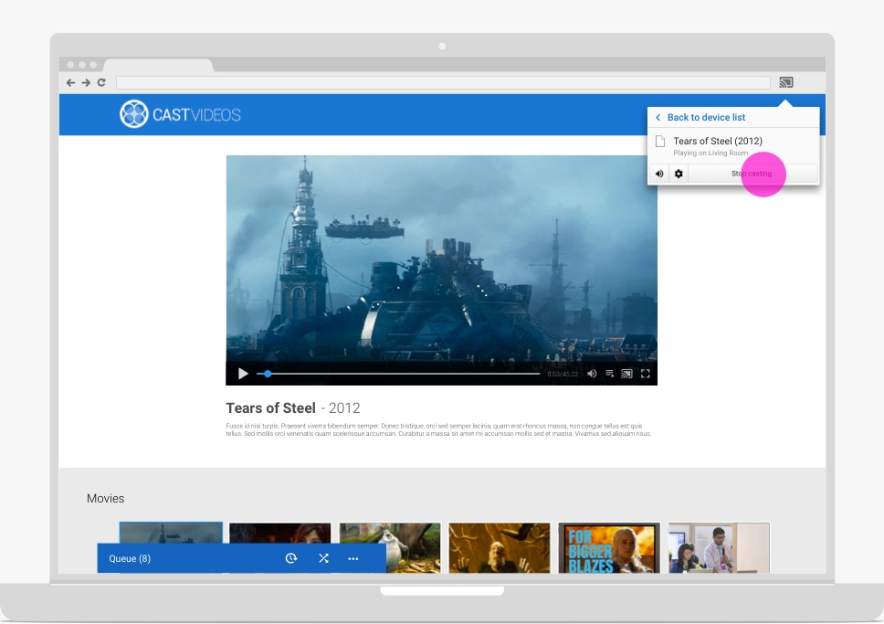 Lo stato e i controlli di riproduzione di Cast dell'app mittente in queste aree devono essere sincronizzati con le modifiche alla riproduzione che si verificano sul Web Receiver, anche se non originate dall'app mittente. Ciò consentirà la corretta gestione sia dei comandi multi-mittente sia del controllo della riproduzione proveniente dai telecomandi, dai pulsanti e così via del dispositivo.