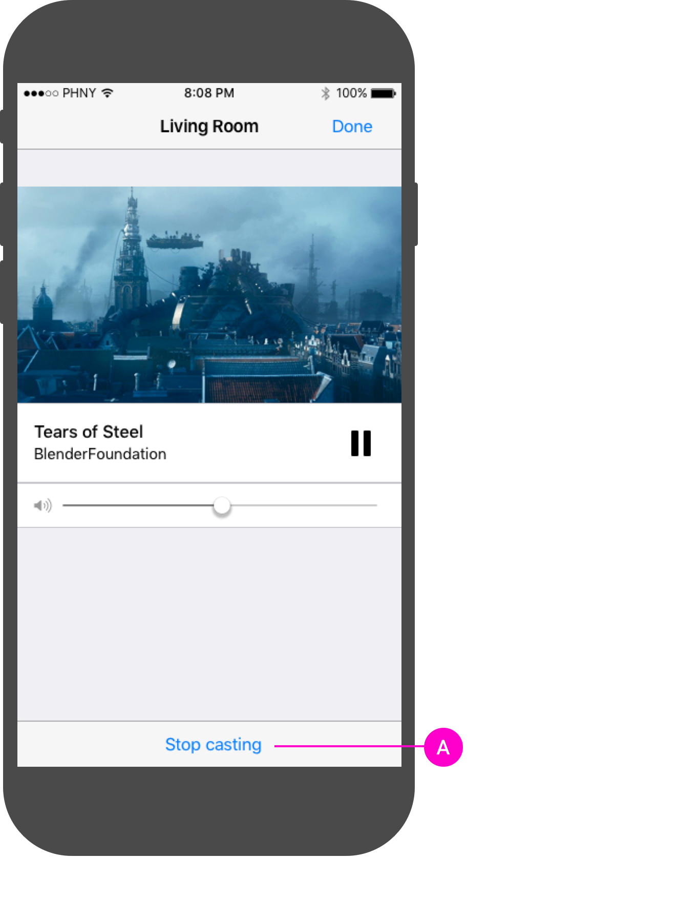 A   Una barra o una casella che mostra i contenuti trasmessi viene visualizzata vicino alla parte inferiore dell'app mittente. Questi controlli rimangono visibili mentre l'utente sfoglia altri contenuti o sezioni dell'app.