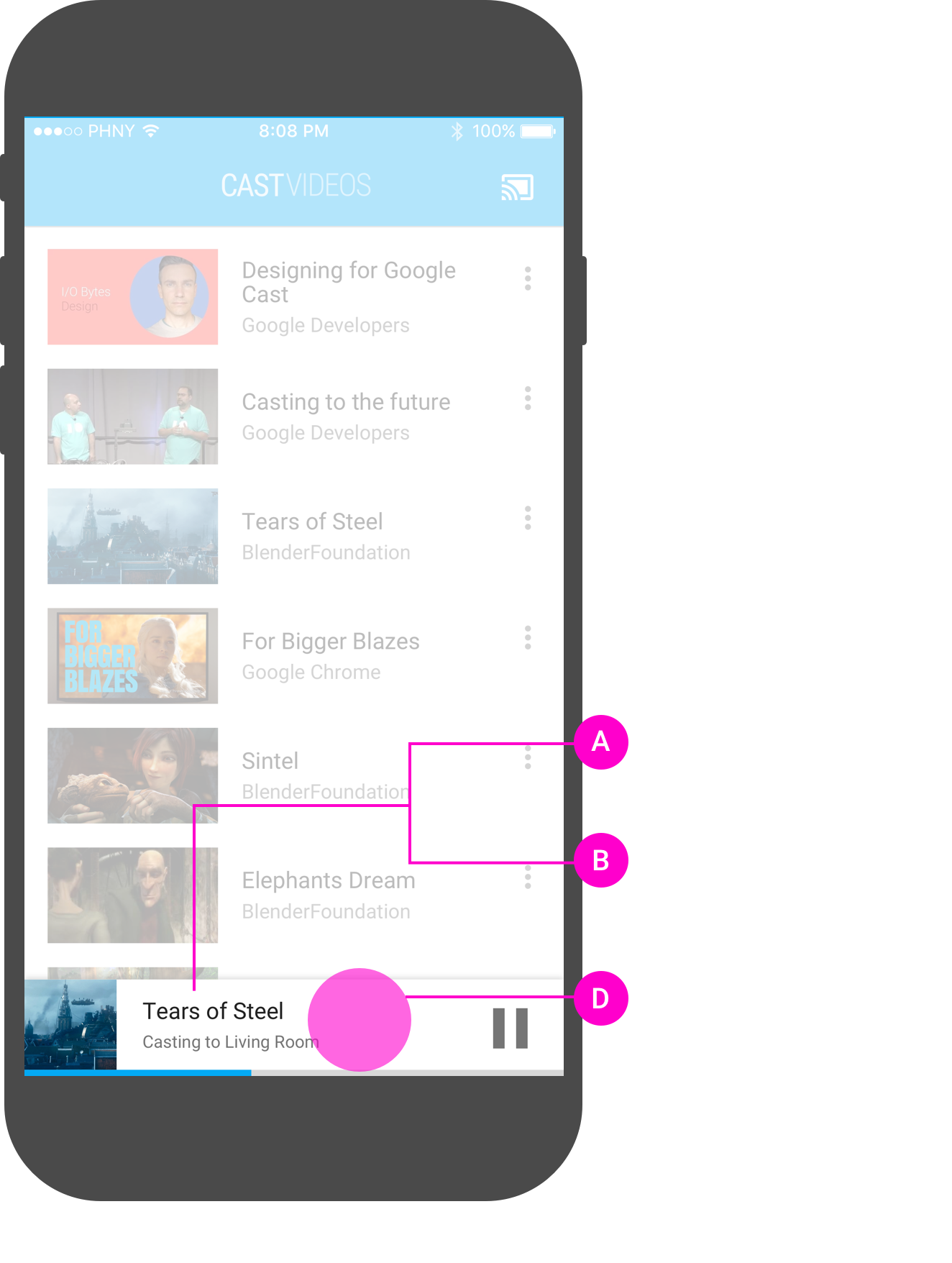 Aplikacje wysyłające powinny udostępniać elementy sterujące Cast w tych obszarach: