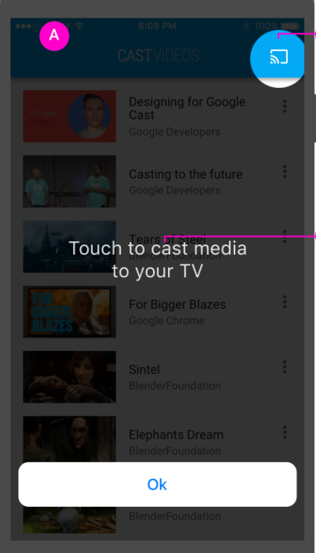 Cast iOS SDK를 사용하면 iOS 발신기에서 기본 위젯의 UI 요소로, 앱의 나머지 부분과 일치하는 디자인과 분위기가 표시됩니다.