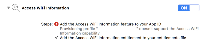 此外,您的预配配置文件还需要支持访问 Wi-Fi 信息 功能。您可以在 Apple Developer 门户中添加此功能。