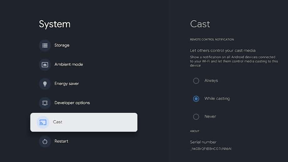 อุปกรณ์ Android TV (ATV) มีหมายเลขซีเรียลหลายหมายเลขที่เชื่อมโยงกับอุปกรณ์ คุณดูหมายเลขซีเรียลของซอฟต์แวร์ (Cast) ได้โดย การแคสต์หน้าคอนโซลนักพัฒนาซอฟต์แวร์ Cast ไปยังอุปกรณ์ ATV ตามที่ระบุไว้ข้างต้น หรือโดยการตั้งค่าอุปกรณ์ ATV เป็นโหมดนักพัฒนาซอฟต์แวร์ แล้วดูหมายเลขซีเรียลของซอฟต์แวร์ ในการตั้งค่า Cast
