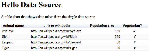// This example extends DataSourceServlet public class SimpleExampleServlet extends DataSourceServlet { @Override public DataTable generateDataTable(Query query, HttpServletRequest request) { // Create a data table, DataTable data = new DataTable(); ArrayListcd = new ArrayList (); cd.add(new ColumnDescription("name", ValueType.TEXT, "Animal name")); cd.add(new ColumnDescription("link", ValueType.TEXT, "Link to wikipedia")); cd.add(new ColumnDescription("population", ValueType.NUMBER, "Population size")); cd.add(new ColumnDescription("vegeterian", ValueType.BOOLEAN, "Vegetarian?")); data.addColumns(cd); // Fill the data table. try { data.addRowFromValues("Aye-aye", "http://en.wikipedia.org/wiki/Aye-aye", 100, true); data.addRowFromValues("Sloth", "http://en.wikipedia.org/wiki/Sloth", 300, true); data.addRowFromValues("Leopard", "http://en.wikipedia.org/wiki/Leopard", 50, false); data.addRowFromValues("Tiger", "http://en.wikipedia.org/wiki/Tiger", 80, false); } catch (TypeMismatchException e) { System.out.println("Invalid type!"); } return data; } }