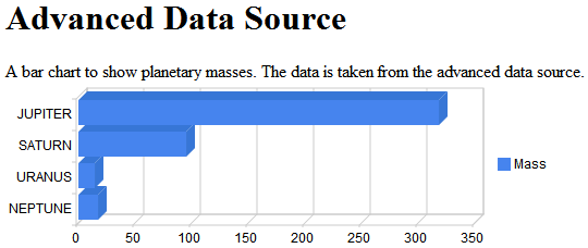 En el siguiente fragmento de all_examples, se especifica el servlet advanced, la tabla planets, una consulta de selección y una visualización de gráfico de barras.