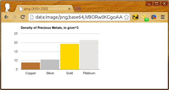 Po uruchomieniu tego programu plik chart_div.innerHTML zostanie ustawiony na następujące kodowanie PNG wykresu i będzie wyświetlany w konsoli JavaScript: