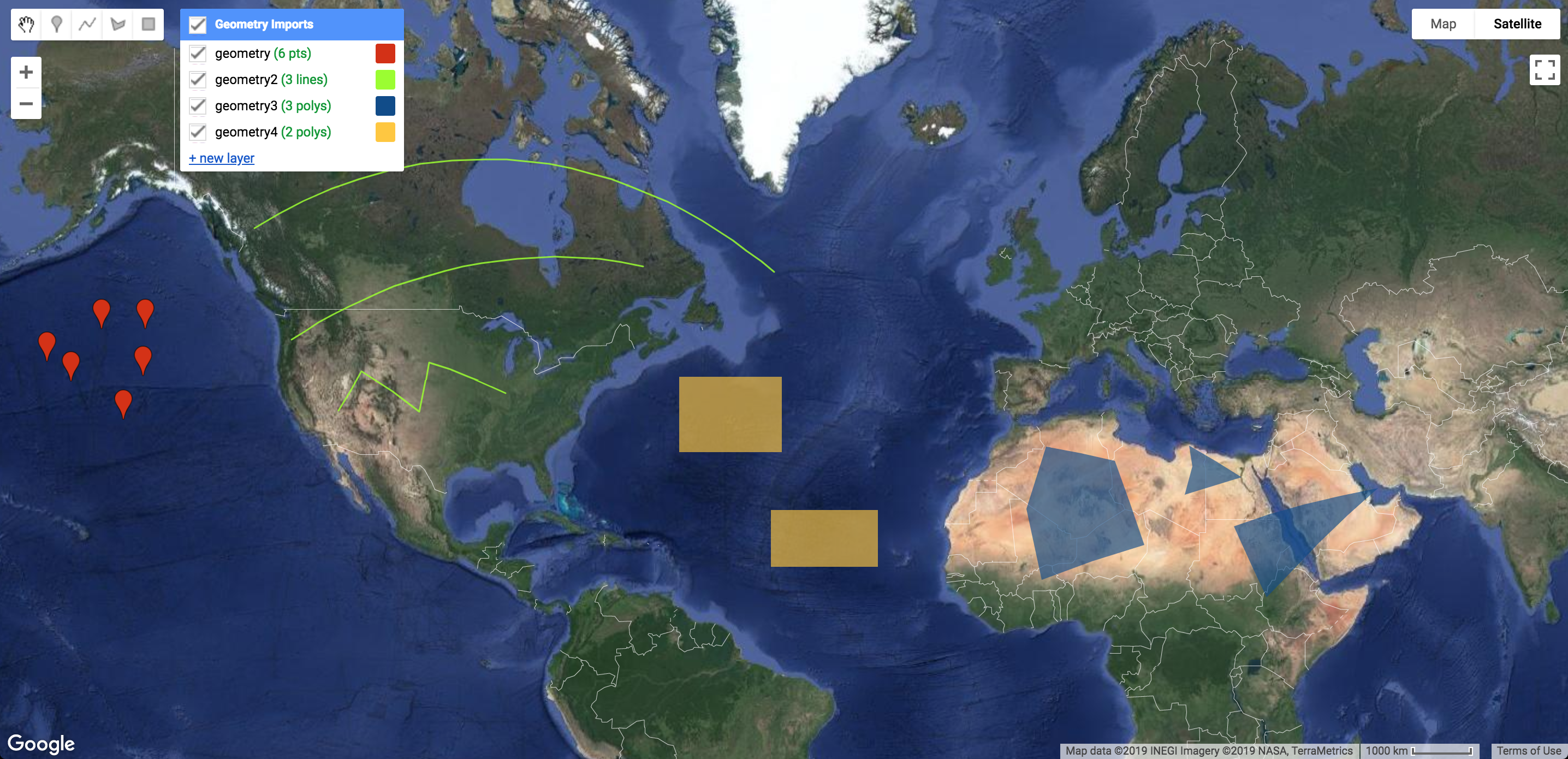 L'utilizzo di uno degli strumenti di disegno consente di creare automaticamente un nuovo livello di geometria e di aggiungere un'importazione per quel livello alla sezione Importazioni. Per aggiungere geometrie a un nuovo livello, passa il mouse sopra Importazioni geometrie nella visualizzazione della mappa e fai clic sul link +Nuovo livello. Puoi anche attivare/disattivare la visibilità delle geometrie dalla sezione Importazioni geometria. Tieni presente che le geometrie disegnate sono geodesiche per impostazione predefinita, ad eccezione dei rettangoli, che sono solo piani. Utilizza il costruttore Geometry per convertirle in geometrie piane. Scopri di più sulle geometrie in Earth Engine nella pagina Geometria.