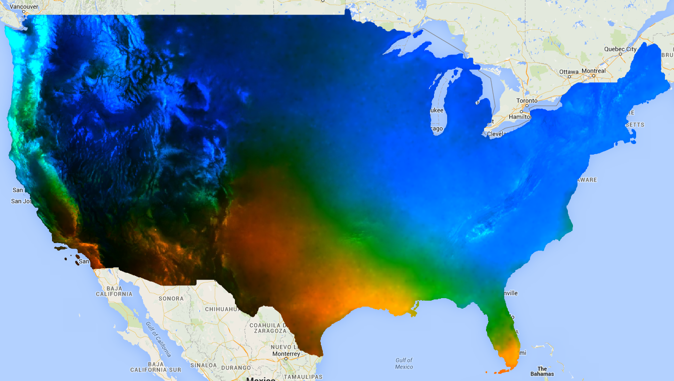 // This function adds a time band to the image. var createTimeBand = function(image) { // Scale milliseconds by a large constant to avoid very small slopes // in the linear regression output. return image.addBands(image.metadata('system:time_start').divide(1e18)); }; // Load the input image collection: projected climate data. var collection = ee.ImageCollection('NASA/NEX-DCP30_ENSEMBLE_STATS') .filter(ee.Filter.eq('scenario', 'rcp85')) .filterDate(ee.Date('2006-01-01'), ee.Date('2050-01-01')) // Map the time band function over the collection. .map(createTimeBand); // Reduce the collection with the linear fit reducer. // Independent variable are followed by dependent variables. var linearFit = collection.select(['system:time_start', 'pr_mean']) .reduce(ee.Reducer.linearFit()); // Display the results. Map.setCenter(-100.11, 40.38, 5); Map.addLayer(linearFit, {min: 0, max: [-0.9, 8e-5, 1], bands: ['scale', 'offset', 'scale']}, 'fit');